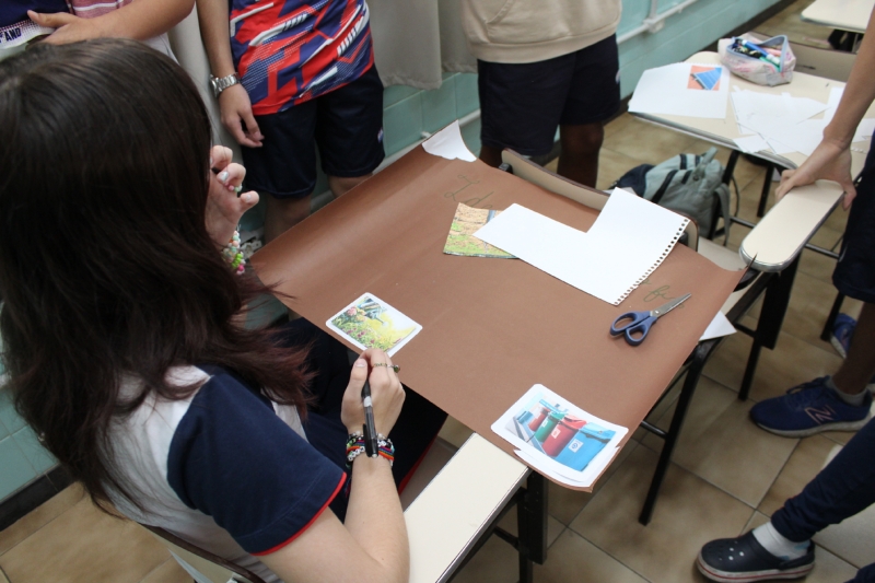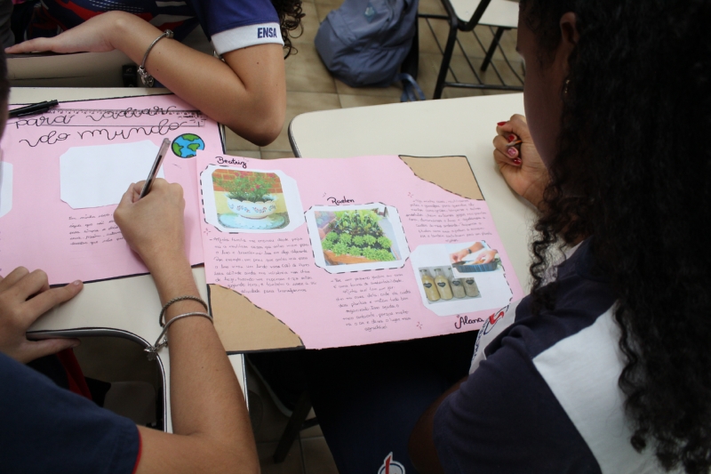 Como proposta pedagógica, os estudantes foram convidados a refletir sobre questões ambientais e, a partir disso, produziram cartazes com suas próprias ideias para evitar o colapso do meio ambiente.