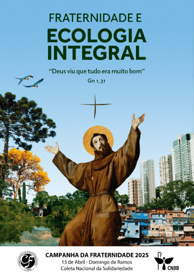O cartaz da Campanha, elaborado com a técnica da colagem, destaca São Francisco de Assis, símbolo da harmonia com toda a criação. Elementos da natureza brasileira, como a araucária, o ipê-amarelo, o igarapé, o mandacaru, a onça-pintada e a arara-canindé, representam a diversidade e a riqueza do nosso país, enquanto a cidade mostra os desafios urbanos para a ecologia integral. A Cruz, no centro, lembra a espiritualidade que nos move neste tempo de Quaresma.
