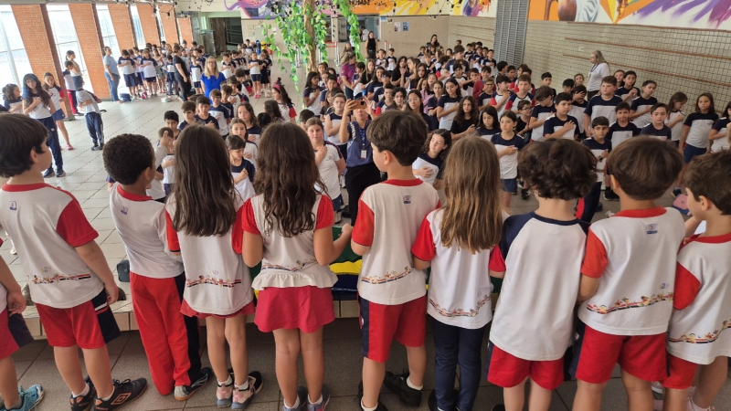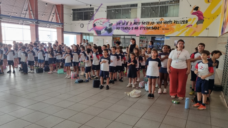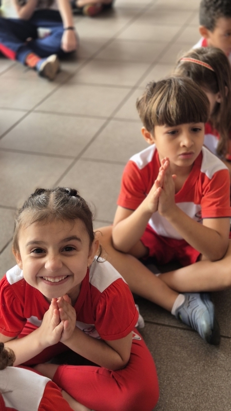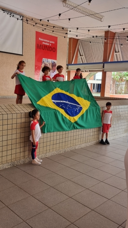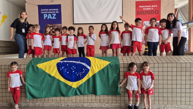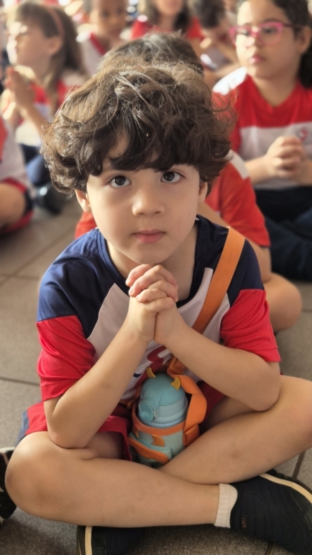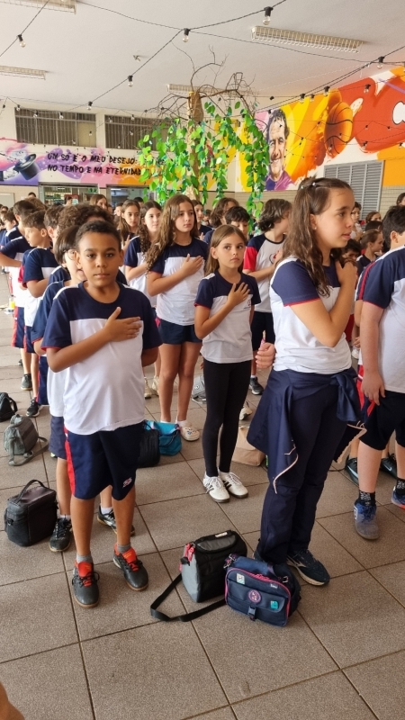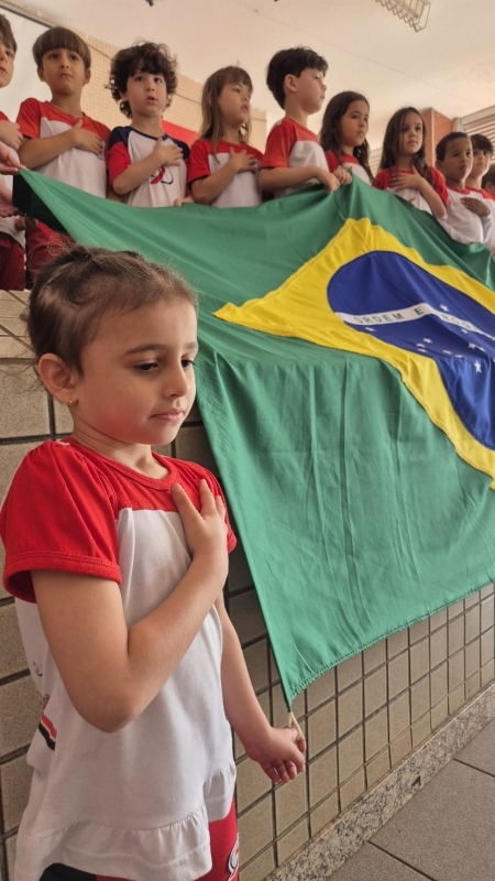 E no Fundamental I, esse momento ganhou um encanto ainda maior. A acolhida da Bandeira contou com a presença especial das crianças do Infantil 3, que em breve iniciarão o 1º ano. Elas foram recebidas com ternura pelos estudantes do segmento, compartilharam o Hino Nacional, permaneceram ao lado da Bandeira em sinal de respeito e descobriram, aos poucos, o sabor desse novo mundo que está chegando. Foi uma alegria ver cada olhar brilhando diante das conquistas que começam a florescer.
