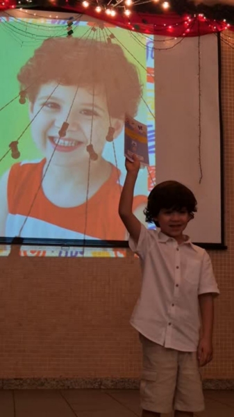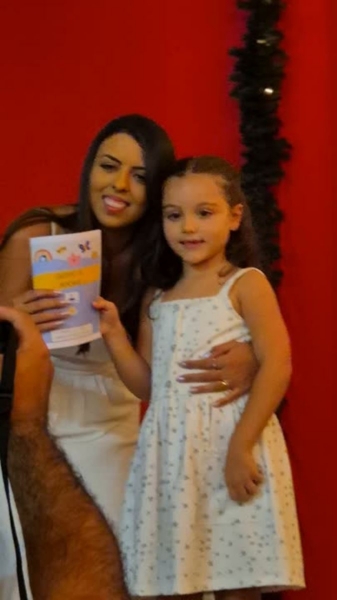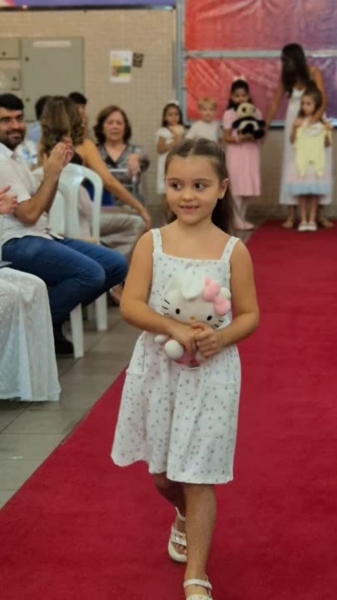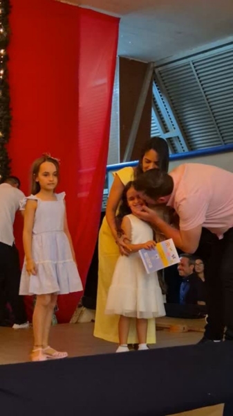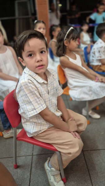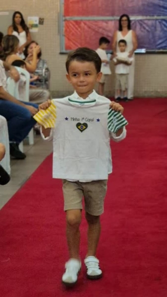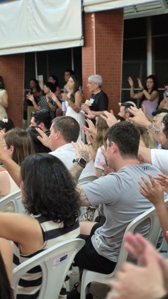 Dando sequência ao momento, as crianças cantaram a música em inglês This Little Light of Mine, que trouxe a mensagem de deixar a luz de Jesus brilhar em cada um de nós. Em seguida, vivenciamos um dos momentos mais simbólicos da noite com a música Sem Perceber, escolhida para representar o tempo que passa, transforma e nos prepara para novos voos. Na sequência, cada criança recebeu seu Caderno de Memórias do Infantil, sendo acolhida pelos aplausos, gestos de orgulho e abraços de suas famílias.